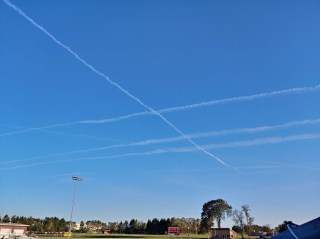 – Ask the question of how far would you drive for free pizza and notice, while you’re eating it, a crapload of plane trails in the sky. Note that chemtrail conspiracy theorists were probably peeing themselves at the sight.