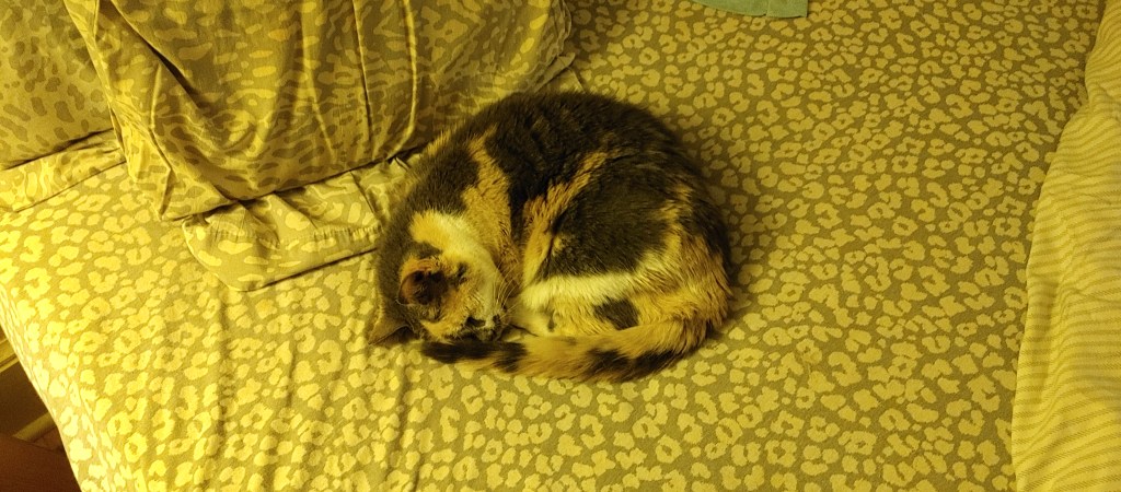 But with the changing I actually did find a new bed lay that do match in this dresser mini wardrobe with the neat doors that click when ya close them above the drawers. I said “oh, cool” almost surprised as I always am whenever I change the bed. Then someone, somefur puked on a pillow the next day, the other one, the one I don’t use for any company I’ll never have or keep. Yeah, funny one universe. You’re a card. It’s sitting on the futon now, drying, along with the “new” pillowcase.