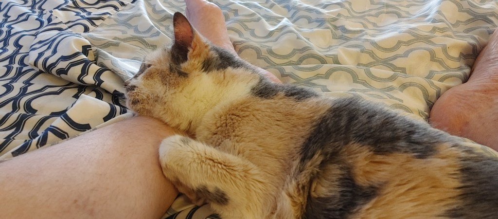 Mimi the Quirky has her spot, after her halting straight legged stick legs walk to under my feet, like struck out of a kid’s bad art project they might discard for another bad arty attempt with her non-committal but please committal pick me up onto a bar towel just above my keyboard. “There ya go Memes, that’s your spot”.