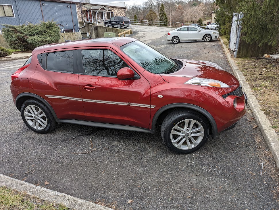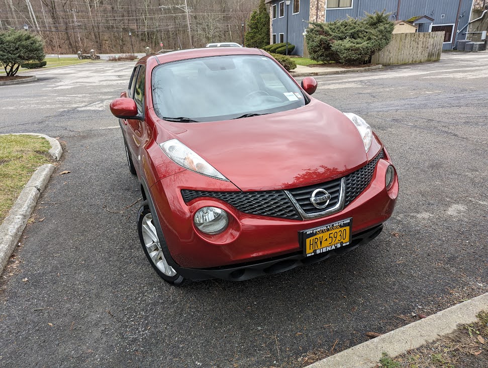 A pretty, red, 6 speed 2013 Nissan Juke.