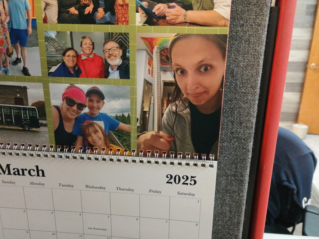 My sister, Beck, every holiday season, goes to Shutterfly with a boatload of pictures in hand and builds a calendar. She’s been doing this since even before Shutterfly existed, she just waited, patiently, builds a calendar as a “stocking stuffer” Christmas present for all of us, each month of the year replete with family photos, about six or seven or so per month.